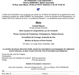 On November 18th, in the premises of “Les Capucines”, the Canardiers were given a lecture by Joëlle and Yvon ROBERT, both long-time members of the Canardiers. The lecture dealt with the Rouennaise writer’s life and work. Mrs ROBERT, who wrote “Un rêve de Flaubert”, focused on gastronomy in Flaubert’s days and novels. Her original and instructive lecture combined literature and gastronomy and was illustrated by excerpts read by her husband. They were accompanied by Valérie DUCLOS, who published “À la Table de Flaubert”, a book of recipes adapted from Flaubert’s work. After thanking their interesting lecturers, the Canardiers were served a meal prepared by Chef Thierry DEMOGET, who found his inspiration in dishes served in Flaubert’s days.