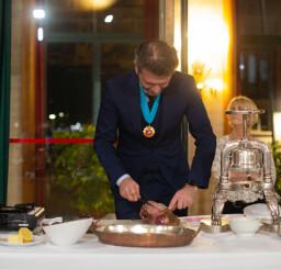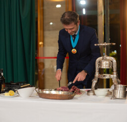 The guests were then offered a cocktail and a dinner prepared by ERISAY Receptions, during which the demonstration was achieved in 2 different spots of the hall by Master Canardiers David BROCHET, Pierre GUERET, Gilles HAUVILLE and Julien MARCHAL-GUERET. The menu consisted of Chestnut Cream Soup with Chips of Lobster, Souffle Sole with Lobster Medallion and Vegetable Julienne in Champagne sauce, Felix Faure-style Rouennaise Duckling (in 2 courses), Cheese, and Dessert.