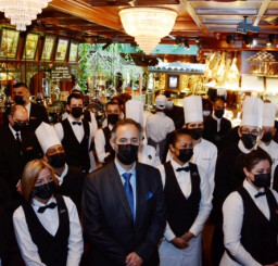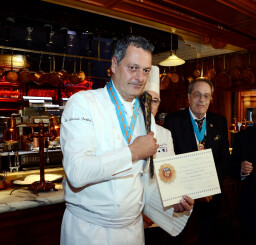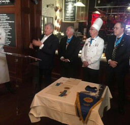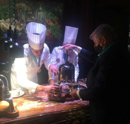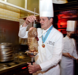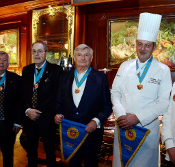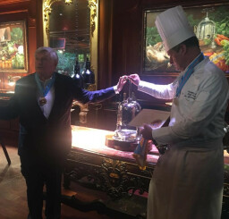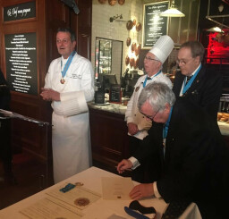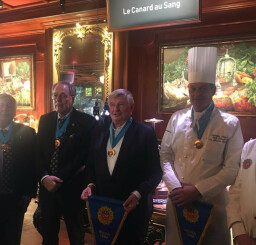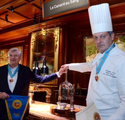 When La Tour d’Argent’s equipment was put up for auction in 2016, Louis PRIVAT, owner of “Les Grands Buffets de Narbonne” bid for their duck press successfully. The Ordre des Canardiers then offered to help him put Rouennaise Duckling on his restaurant’s menu. Gilles HAUVILLE, Master Canardier, travelled to Narbonne and showed the kitchen staff and the waiters how to prepare the dish. Gérard COUDRAY, Philippe DUJAY and Jean LOISEL, accompanied by their spouses, went to Narbonne to make Louis PRIVAT Canardier of Honour and Chef Philippe MUNOS Master Canardier. The induction ceremony was followed by a demonstration by Gérard COUDRAY and Philippe MUNOS, which was filmed by French TV Channel C8 for a programme to be broadcast soon.