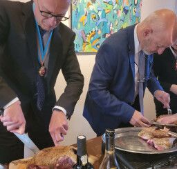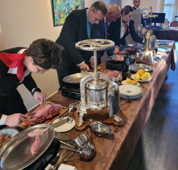 A 19h15, c’est donc dès l’arrivée des convives , que les élèves entourés des Maîtres Canardiers, Serge Goulaieff , Gilles Hauville et Jean-Jacques Ganon , commencent la découpe des canards avec des gestes appris deux heures auparavant . Mais, le temps est compté. Il faut travailler et servir 11 canards et, très vite , les trois Maîtres Canardiers offrent leur concours, et leur dextérité et leur efficacité permettent un remarquable enchaînement. Le rythme est donné mais, le travail de 11 canards rend le temps long et pour éviter l’ennui et la lassitude du public , qui pourraient gâcher la Fête ,Jean-Louis GUIBEY « embarque » les convives dans un voyage avec et autour du canard sur 2500 ans d’Histoire. Le public adhère, écoute, questionne et la soirée prend allure de dîner attractif, conférence, échanges, avec le canard au cœur des discussions et en finalité une bonne dégustation.