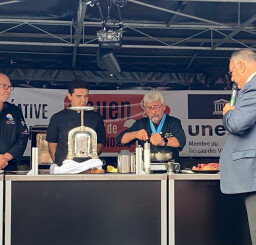 Mi-octobre, le centre de Rouen se transforme en un marché de produits locaux et régionaux dans le cadre des Fêtes du Ventre. A cette occasion, des présentations culinaires sont réalisées sur différents stands de démonstration. C’est sur celui de la Ville de Rouen que l’Ordre des Canardiers a été invité à faire découvrir la recette du Canard à la Rouennaise en ce 14 octobre. La démonstration a été réalisée par Jean-Paul LAVISSE, Maître Canardier, assisté de Patrick COIGNARD de C2 La Cuisine et d’un cuisinier du restaurant « La Couronne ». Une cinquantaine de personnes ont ainsi pu découvrir la recette, la démonstration étant retransmise sur écran, puis la goûter.