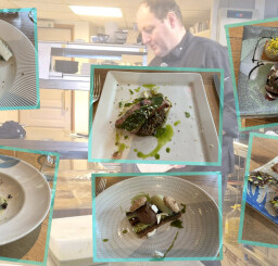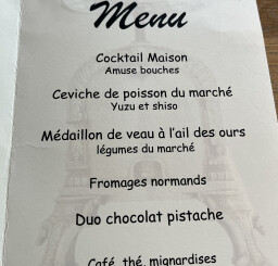 A l’issue de la visite, plus de 20 convives se sont rassemblés à l’Auberge des Ruines, dont le propriétaire Christophe MAUDUIT venait de recevoir son étoile verte Michelin, symbole d’une cuisine éco-responsable. Un céviche de poisson avec yuzu et chizo, suivi d’un médaillon de veau à l’ail des ours et ses petits légumes avant de terminer par des fromages normands et un duo chocolat – pistache qui ont fait le bonheur des participants.